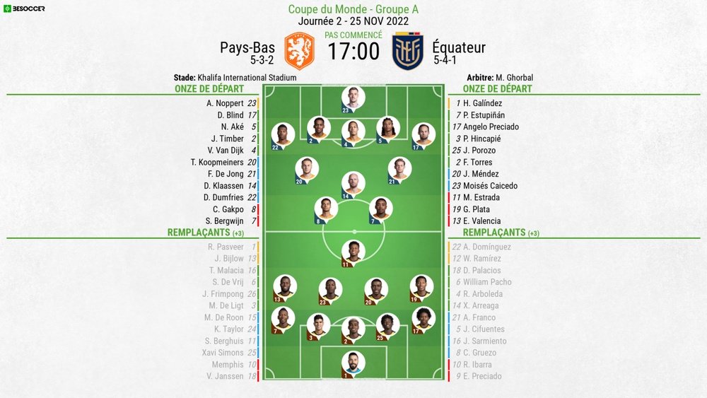 . La rencontre de la Coupe du Monde opposant les Pays-Bas à lÉquateur est à. Avant match compositions programme TV. Web Suivez le match Pays-Bas - Équateur la 2e journée de Coupe du Monde 2022 Qatar 2511 en direct live.